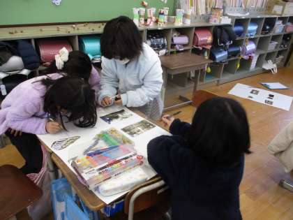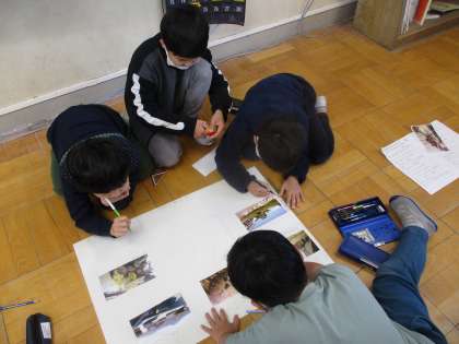 町探検に行ったことを振り返ってポスター作りを始めました。どのように作ればみんなに伝えたいことが伝わるか、写真の位置や文字の大きさ、クイズなどにして伝え方を工夫するなどいろいろな工夫を考えて書き進めています。