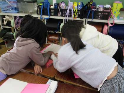 物語に出てくる「すみれちゃん」という登場人物の女の子の行動や言動の中で、一番心に残ったことを一つ見つけ、自分と比べて感想を書きました。すみれちゃんのこんなところはすごい、こんなところは違うなど違いを見つけながら上手に感想を書いていました。感想を交流すると面白そうに聞きあっていました。