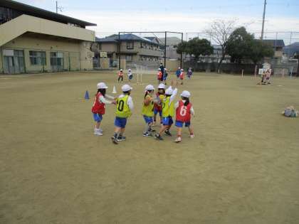 ゲームや準備などにもだいぶ慣れてきました。どこにパスをだそうか、どこを守ればボールをとれるかなど考えながら、楽しく活動しています。