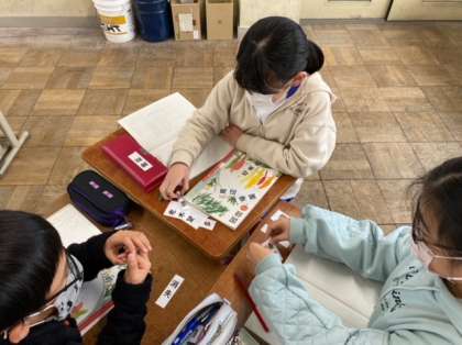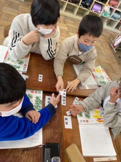 国語科「熟語の意味」では、漢字の組み合わせをもとに熟語の意味を考えました。「反対の意味の漢字が組み合わさっているから…」「上の漢字が下の漢字をくわしくしているから…」と、班で話し合いながら熟語の意味を考えました。
