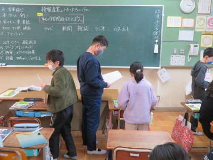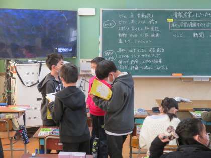 社会科の学習で,自分の生活とメディアとの関わりについて学習しています。今日の学習では,身の回りのメディアの特徴について話し合いました。
