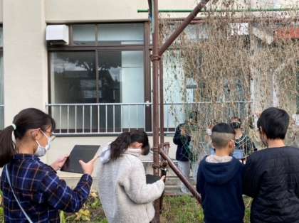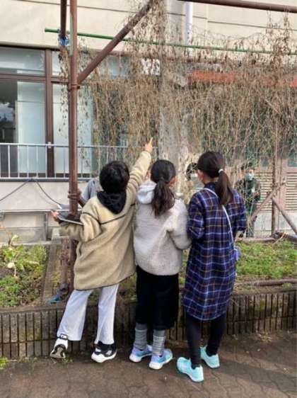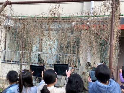 理科「季節と生き物」の学習で、ツルレイシの観察を行いました。「葉もくきも茶色くなり、全体的にしおれている。」「葉をさわってみるとザラザラ、パリパリしていた。」と、秋の終わりの様子と比べながら冬のツルレイシの様子を話し合いました。