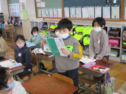 国語科の時間に「こえに出してよもう」の学習をしました。のはらうたの住人のかわいらしい詩に子どもたちもほっこり。どんな声の大きさで読めばよいかな,読む速さはどうしようかななど工夫しながら読んでいました。毎日の音読の宿題で,ばっちり暗記した人もいます。音読する楽しさをどんどん感じてほしいです。