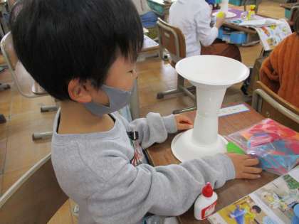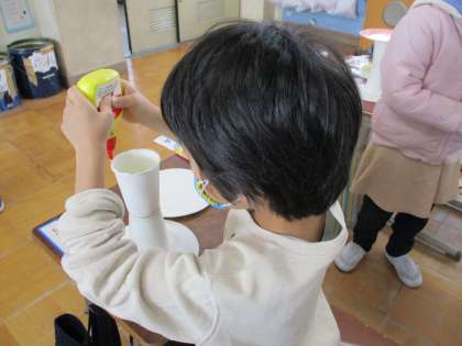 図画工作科の時間に,紙皿や紙コップを使って,「かみざらコロコロ」の学習をしました。紙皿の間にはさむ形を変えたり,透明なコップの中にきれいなかざりを入れたりと,それぞれが工夫しながら作っていました。ボンドのつけ方にも苦戦しながら,きちんと転がるように貼り付けていました。