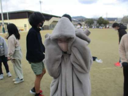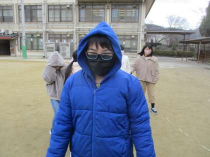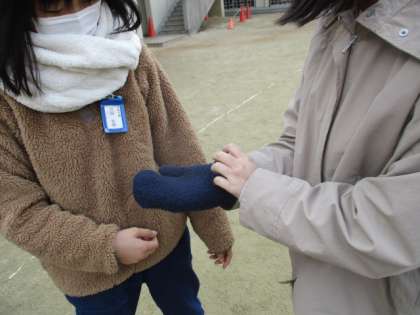 家庭科で,衣服の暖かい着方を学習しています。体のどの部分を,どうやって隠すと暖かいかを考え,実践してみました。手袋を2枚重ねたり,首を隠してみたりしました。重ね着すると,ずいぶん暖かさが変わるなど気づくができてました。