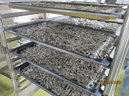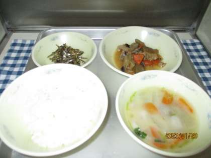 今日は正月料理でした。「みんながなかよくすごせますように」という願いが込められている「煮しめ」は、しいたけやお肉のだしが、いろいろな食材にしっかりとしみていてとてもおいしかったですね。ごはんととても合いました。また、「ごまめ」は昔は田んぼの肥料として使われていたことから、「お米がたくさんとれますように」という願いが込められています。給食のごまめは、スチームコンベクションオーブンをつかってカリッと焼いたすぼしに、あまからいタレをからめて作りました。