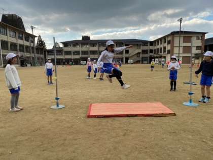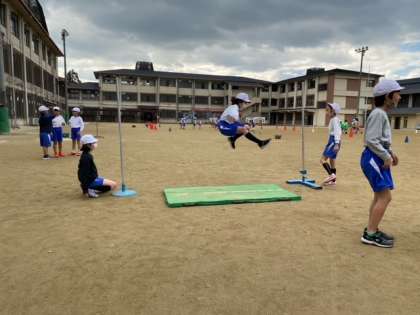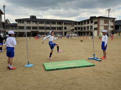 体育科「高跳び」では、それぞれに目標を立てて記録に挑戦しています。「足を高く上げるために腕も一緒に上げよう。」「思い切り踏み切るために、助走でスピードをつけよう。」と、跳び方を工夫して挑戦しています。
