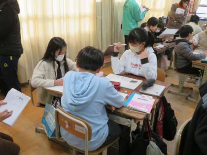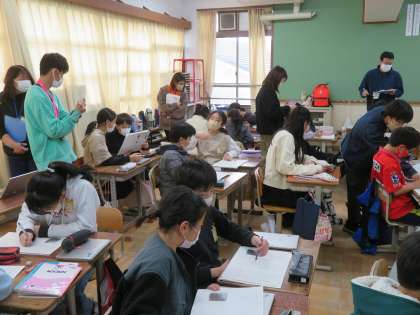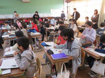 今日の国語の学習には,たくさんの先生方が見に来てくださいました。物語の魅力を引き立たせるような一文を見つけて話し合う姿を見て,たくさんの先生方に褒めていただきました。