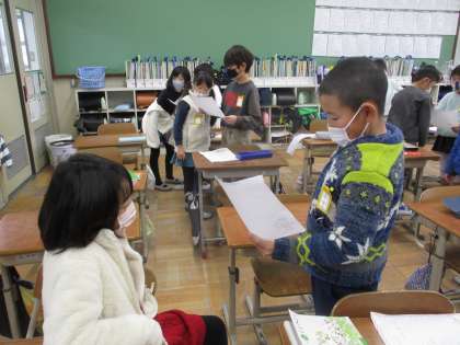 自分で調べて気に入ったお気に入りの詩を友だちにプレゼントしました。GIGA端末を使って上手に調べていたり、おうちでお気に入りの詩を選んできたりと友達に喜んでもらえるように詩を選んで、友達にお気に入りの詩をよんでからプレゼントしました。カードは丁寧な字で書いたり、色を塗ったりしてから渡し、貰った子もとても喜んで詩をよんでいました。