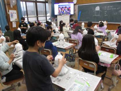 粘土を使って顔を作りました。ペットボトルに薄く粘土を広げて土台を作り、顔のパーツを張り付けていきました。出来上がりを見てみるとみんなしっかりと似ていてよく仕上がっているなと驚きました。色付けするともっと本人たちに近づくいくのではないかと色付けするのが楽しみです。