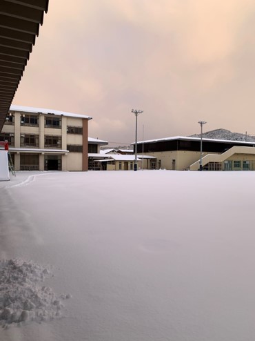 おはようございます。雪が積もっています。路面の凍結や落雪に気をつけて登校してください。靴下などの着替えを持たせていただくと良いかと思います。よろしくお願いいたします。