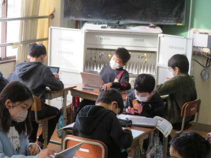 社会科の学習で情報メディアについて学習しています。最初にニュース番組の作られ方をまとめ,その後は自分の興味のあるメディア(新聞やインターネットなど)について調べてまとめています。