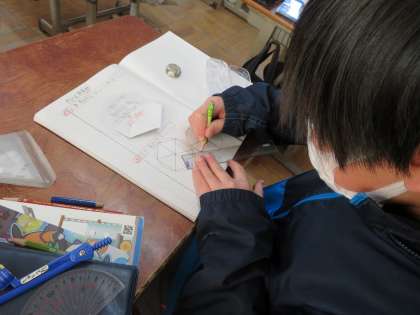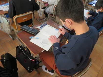 算数の学習で正多角形をかく方法を考えました。分度器やコンパスを使って正五角。形や正八角形をかく活動では,既習の角度の計算方法も生かしながら作図をしていました。