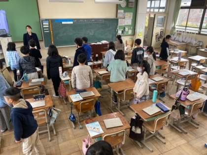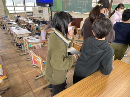 外国語活動では、英語を使って学校の中のお気に入りの場所をしょうかいしています。しょうかいに使う「go straight」「turn left」などの言い方をゲームで確認した後、タブレット端末で撮影しながら校内の道案内をしました。