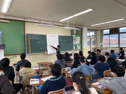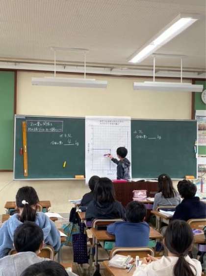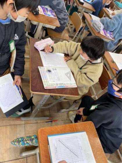 算数科「変わり方」では、2つの数の変わり方の様子をグラフで表しました。「グラフが一直線になった。」「決まった数がグラフからも読み取れる。」と、グラフからわかることについて話し合いました。