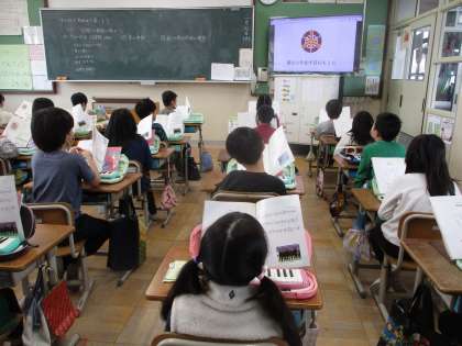 音楽科の学習で、「国歌」「京都市歌」「岩倉南小学校の校歌」を聞き、歌いました。それぞれの歌のリズムや曲を聞いて気付いたことを話し合いました。日本の国歌がゆったりしていることや、京都市歌は繰り返しがあること、京都の自然のことを歌っているなど気づきを見つけながら聞いていました。京都市歌は初めて聞いた子どもたちも多く、初めて知って驚いていました。