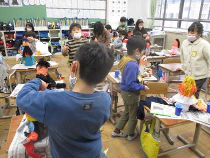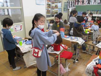 作品展に展示する作品もいよいよ完成が近づいています。粘土で作った将来の自分に色を付け、ニスを塗り、服を着せ、髪の毛を毛糸で作りました。月曜日にポップを作ったり、最後の仕上げをしたりして火曜日に展示します。子どもたちは将来の姿を思い浮かべながら一生懸命作っていました。フェルトや毛糸のご準備ありがとうございました。火曜日から体育館にて展示していますので、授業参観・懇談会の際にまたご覧ください。