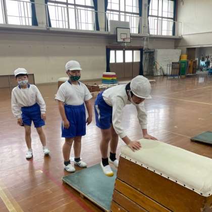 跳び箱運動では「手のつく位置を意識して美しく跳ぶ」など毎時間自分のめあてを持ち、取り組んでいます。腰を高く上げる練習をした後実際に跳んでみると、上手く跳び越えることができたようです。