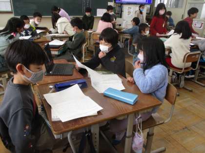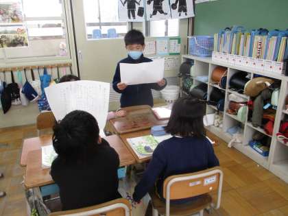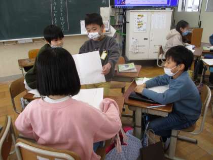 図書館の本の中から自分で面白いと思った遊び方を調べてカードにまとめました。遊び方やその遊びの面白さ、もっと面白くするためにはどんなルールを加えたらいいかなど考えてカードにまとめました。カードを班で発表し、お互いに「面白そう」「そのルールいいな」など感想を伝えあっていました。