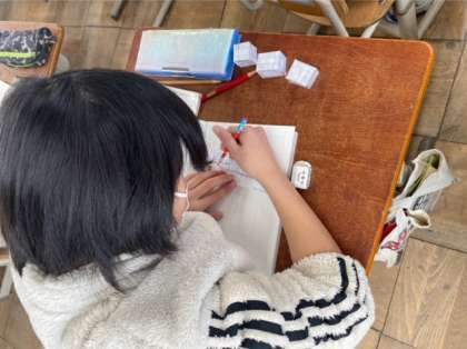 算数科「直方体と立方体」では、見取図のかき方を学習しました。「横の面は少し小さく見えるな」「見えていない辺は点線でかくといいんだな」と、立体を平面でかく時のポイントを見つけてかいていました。