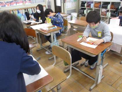 算数科の学習では、「はこの形」の学習が始まりました。箱と包装紙のご用意ありがとうございました。持ってきた箱の形を紙や包装紙にかたどって、1枚1枚面に貼って面の形や数を調べました。「はこの形はいろいろあるけど、面の数は6つなんだ」「種類はたくさんあるけど、正方形と長方形の組合せなんだ」と箱について気付きながら学習していました。