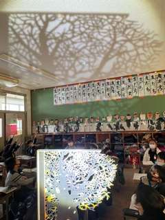 モチモチの木の学習では「豆太は見た」の場面で実際に教室にモチモチの木を映し出して見ました。子どもたちも灯のついたモチモチの木に大興奮でした。