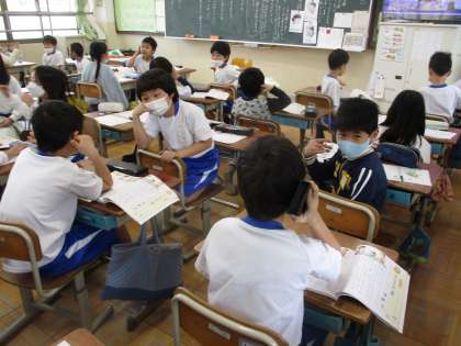 「お兄ちゃんの電話」という題材で、電話の礼儀について考えました。電話の相手によって話し方を変える登場人物の姿からどうして話し方を変えるのかについて考えました。考えた後に、「友だちの家に電話をする。友達のお母さんが出る。友だちに代わってもらうお願いをして、友だちと遊ぶ約束をする。」という想定で電話の練習をしました。お母さんに対しては「です、ます。」を使って話し、友だちには仲良さそうに話していました。またお家でも聞いてあげてください。