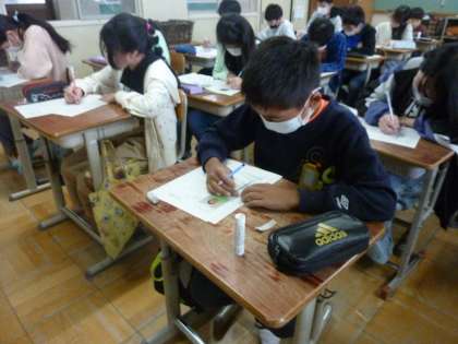 生き方探求パスポートを書いている様子です。この1年間、学習や生活で頑張りたいこと、挑戦したいことなど目標を書きました。目標に向かって頑張ってほしいと思います。