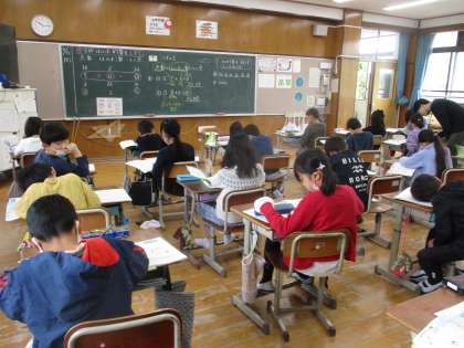 算数科の学習では、九九の表を見ながら九九にないかけ算の学習を進めています。「〇ずつ増える」「〇ずつ減る」という九九のきまりをつかいながら10のかけ算や0のかけ算の解き方を考えています。