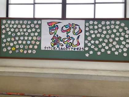 いろいろな形や色の花があるように、5年生一人一人にも個性があり、たくさんのいいところがあります。その一人一人が今年一年、様々な花を咲かせてほしいと願いをこめて、5年生の学年目標を「百花繚乱」としました。「何事もあきらめない。」「何でも挑戦!」などと、子どもたちは咲かせたい花がまわりに散りばめられています。たくさんの花を挑戦しながら、協力しながら咲かせてほしいと思います。