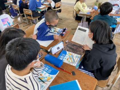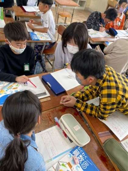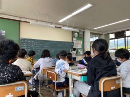 算数科「整数と小数」では、10倍や10分の1した時の小数点のうつり方について学習しています。位の部屋に分けたり、小数点のうつり方を矢印に表したりと、ノートに自分の考えを工夫して表しています。
