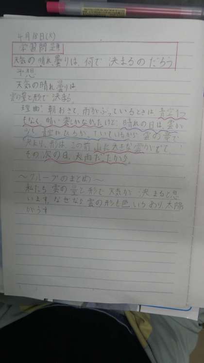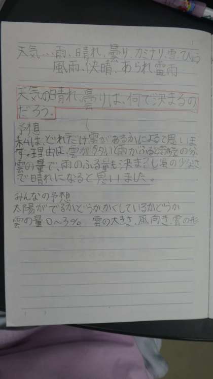 それぞれが考えた意見を出し合い,晴れとくもりのちがいを話し合いました。