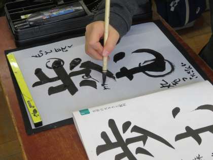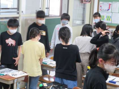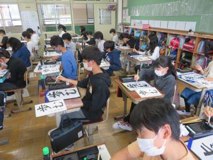 書写の学習で、文字の大きさと配列に気をつけて「歩む」を書きました。練習を始める前に、まずは1枚書いてお互いの作品を見合いました。教科書に書いてあるコツでなく、自分が実際に書いて見つけたコツだからこそ自信をもって友達に伝えていました。