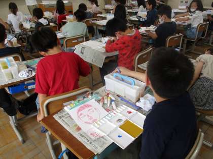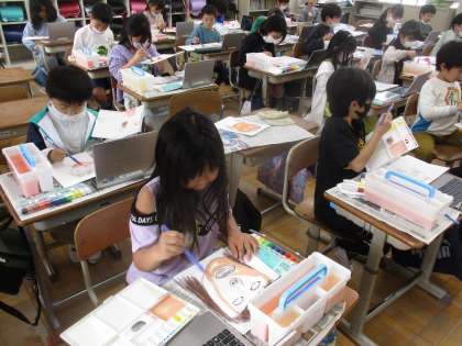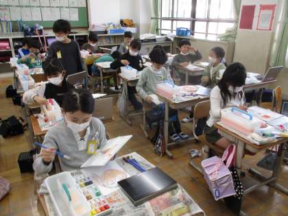 コンテで下書きした顔に絵の具で色を塗りました。GIGA端末で写真を撮った自分の顔を見ながら、上手に色を混ぜ合わせ、自分に合った肌色を作って色を塗っていました。授業参観の際に各学級に掲示しますので、また見てあげてください。