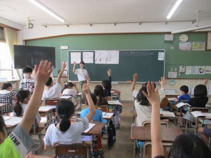 算数科「角の大きさ」では、分度器を使って角度を求める学習をしています。子どもたちは与えられた問題を協力して解いていました。分度器を使わなくても、三角定規の角度を覚えていると、計算で求められる問題があるということに気づき、大変驚いていました。