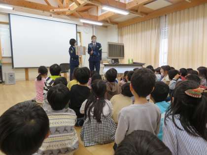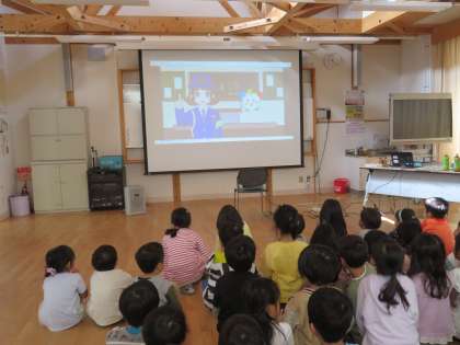警察官の方に来ていただいて、安全に道路を横断したり歩いたりするためにどんなことに注意したらいいのかを聞きました。
