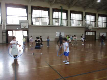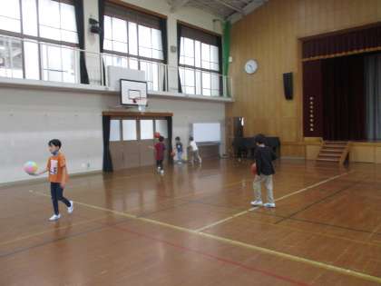 3年生では金曜日の中間休みに体育館あそびをして楽しんでいます。ボールを使ったり、フラフープを使ったりしてみんなで仲良く遊んでいます。