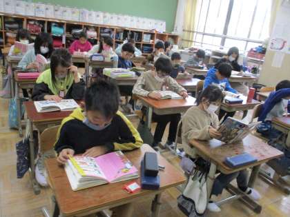 毎日、朝読書の時間があります。子どもたちはこの時間になると、とても静かに、集中して本を読みます。本を読み終わると「面白かったよ!」とお勧めしたり、内容を教え合ったりしている姿をよく見かけます。4年生でもたくさん本に慣れ親しんでほしいと思います。