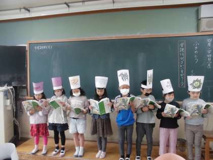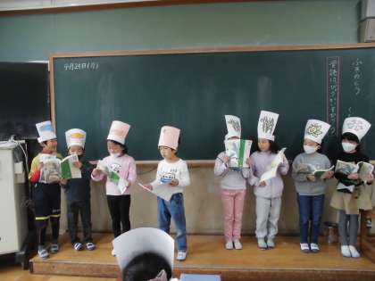 今日は「ふきのとう」の音読発表会を行いました。これまでに、様々な音読の工夫を考えてきました。「ささやいているように小さくやさしく言う」「みんなを見守っているように、明るく元気よく大きな声で言う」など、それぞれのめあてを大切に発表することができました。これからの学習でも、今回学んだ音読の工夫をぜひ生かせたらなと思います。
