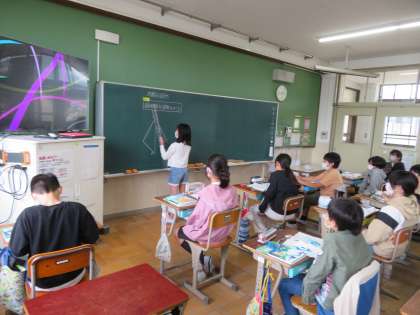 算数の学習で、線対称な図形の作図を学習しました。コンパスを上手に使って、対応する点を見つける方法を前に出て教えてくれました。前に出て教えることが得意でない子も個別で友達に教えてくれました。ともに支え合って学習を進めています。