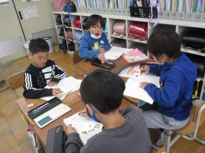 明日の音読発表会に向けてグループごとに音読の工夫を考えて、練習をしました。教科書に線を引いたり、どのように読むかしるしを書き込んで工夫のポイントを考え、どのグループも上手に練習していました。明日の授業参観で緊張しながらも頑張って発表してほしいと思います。