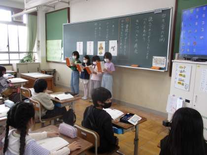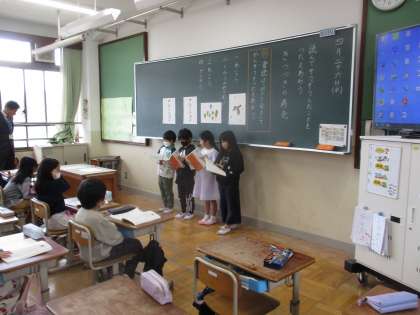 今日は、音読発表会の本番でした。グループごとに音読の工夫を考えて発表しました。役割を工夫したり、音の言い方を工夫したり、おうちに人の前で緊張しながらも上手に発表していました。お足元の悪い中、お越しくださり、ありがとうございました。