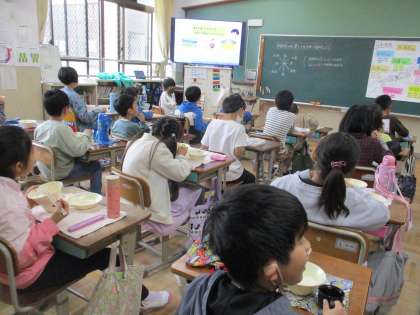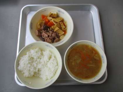大人気の和み献立でした。子どもたちは「だしのうまみってこれのこと?」「キャベツが旬の野菜なんだ」など、つぶやきながら食べていました。4年生は今日も完食でした。