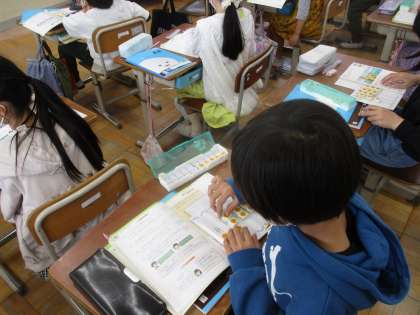 15枚の色紙を「3人に同じ数ずつ分けると1人分は何枚になるか」「1人3枚ずつ分けると、何人に分けられるだろうか」の問題について、数図ブロックを使いながら計算の工夫を考えました。「どちらも15÷3になるけど、何が違うだろうか」「難しいな」など言いながら、数図ブロックを動かし、「一人分の数」「人数」というところの違いに気づいていました。
