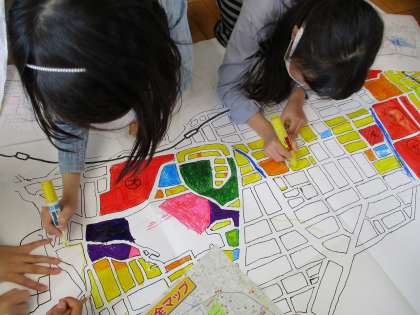 社会科の学習の一環として,校区のどのような場所があるのかをまとめて地図にまとめています。