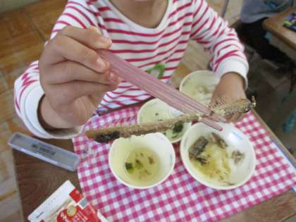 今日は1年生が初めての煮魚でした!お魚博士と勉強した上手な骨のとり方を思い出しながら、一生懸命とっていました。「上手にとれた!」とうれしそうに見せてくれた人もいました。さんまの変わり煮は、調理員さんがじっくりと時間をかけて煮てくださったので、骨までやわらかく、ごはんとよく合う味でした。「ごはんと食べてもおいしい!」「骨まで食べられた!」「めっちゃおいしかった。」と元気な声をきくことができてよかったです。