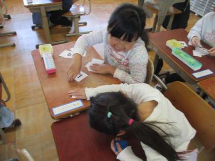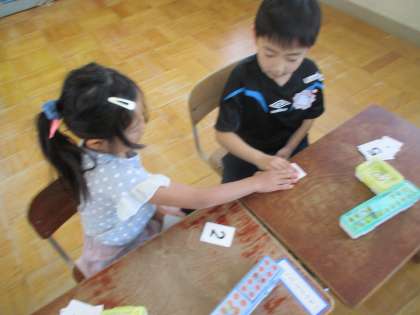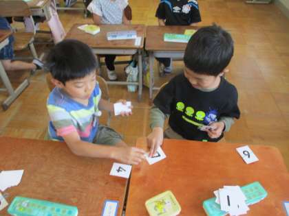 算数科「かずとすうじ」の学習で、カードゲームをしました。二人で対決。大きい方はどっち?楽しく学習できました。