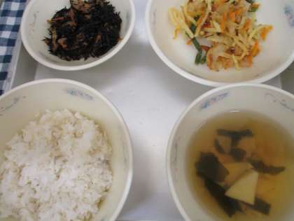 でした。今日は、なごみ献立で、新献立の新じゃがいもを使ったかきあげと、春においしい竹の子を使った若竹汁が登場しました。たくさんの人が新献立の感想を聞かせてくれました。6年生からは、「かきあげ、めっちゃおいしい!来年食べられないのが残念・・・!」「これが、新じゃがか!おいしい!」「いろんな食感が楽しめる。」と大好評の声を聴くことができました。また、「若竹汁、めっちゃおいしい。だしが入るだけでなんでこんなにおいしくなるんやろう・・・?うま味ってすごい!」「これ・・・うまっ!若竹汁じゃなくて、うま竹汁やな!」と素敵な感想もいただきました。