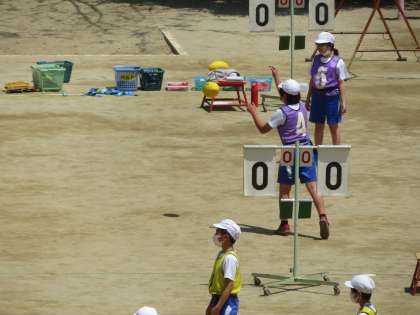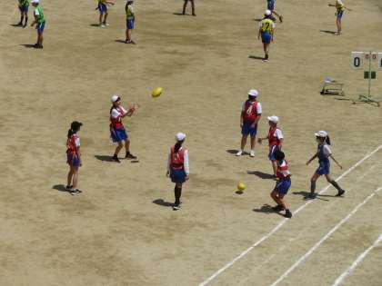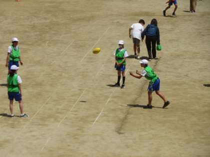 タグラグビーの学習で、チーム練習をしている様子です。相手に取りやすいパスを出す練習をしました。