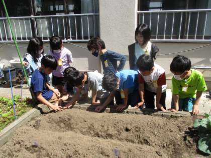 今日は「大豆」「オクラ」「ほうせんか」「ひまわり」の種をまきました。水やりや声掛けをしながら、成長の様子を観察していこうと思います。大きく育つのが楽しみです。